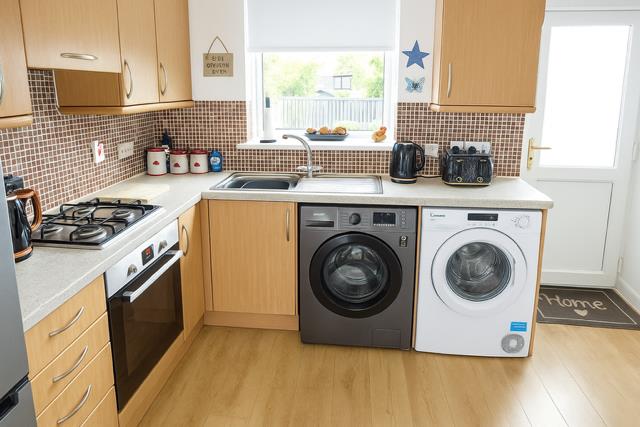 Generously sized modern kitchen with ample cupboard space and direct garden access